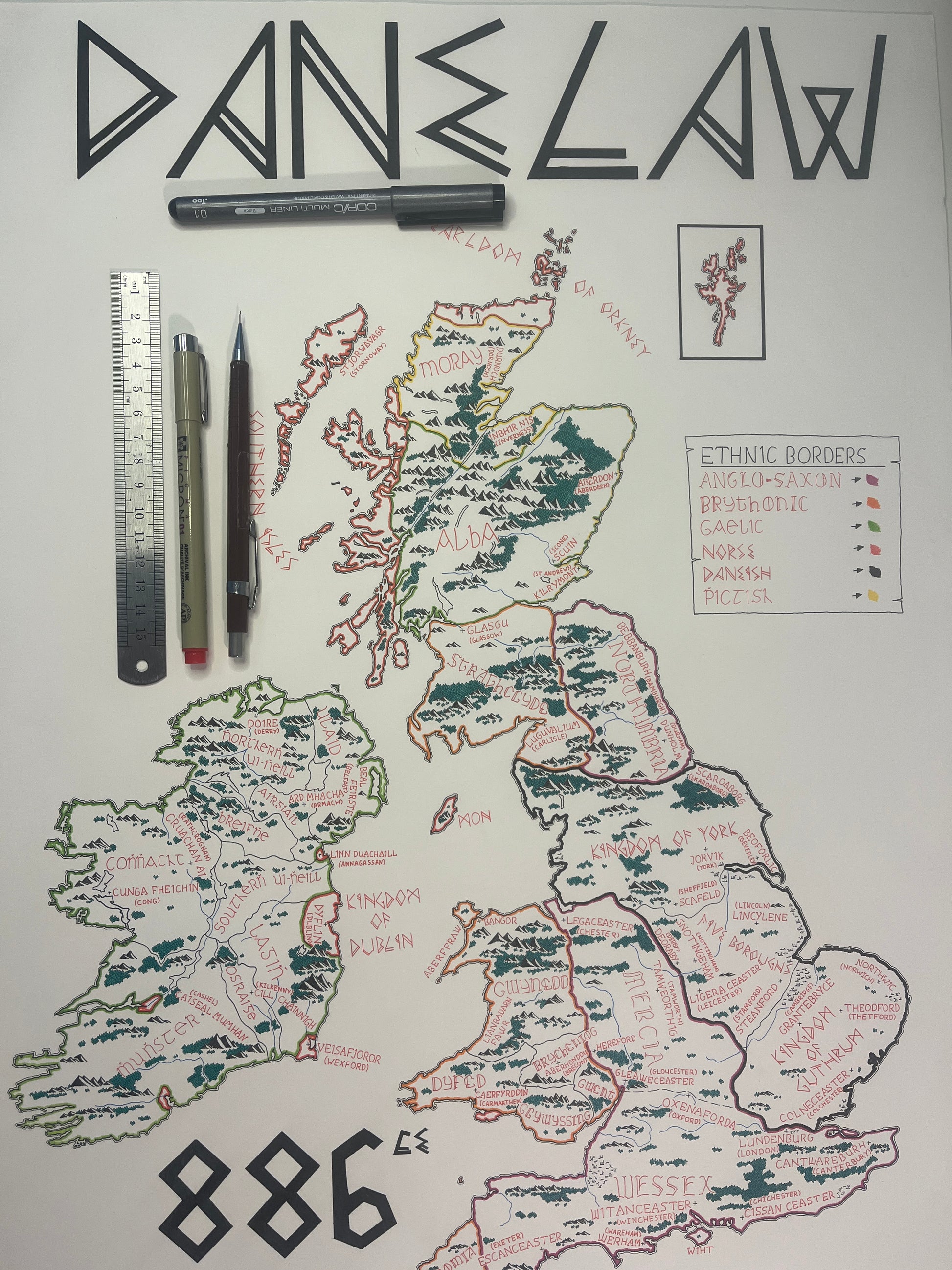 A high-quality print of a hand-drawn map showcasing the British Isles during the era of the Danelaw. Produced on premium heavyweight paper, it captures fine detail with clarity and offers a lasting, elegant finish — perfect for framing or display.