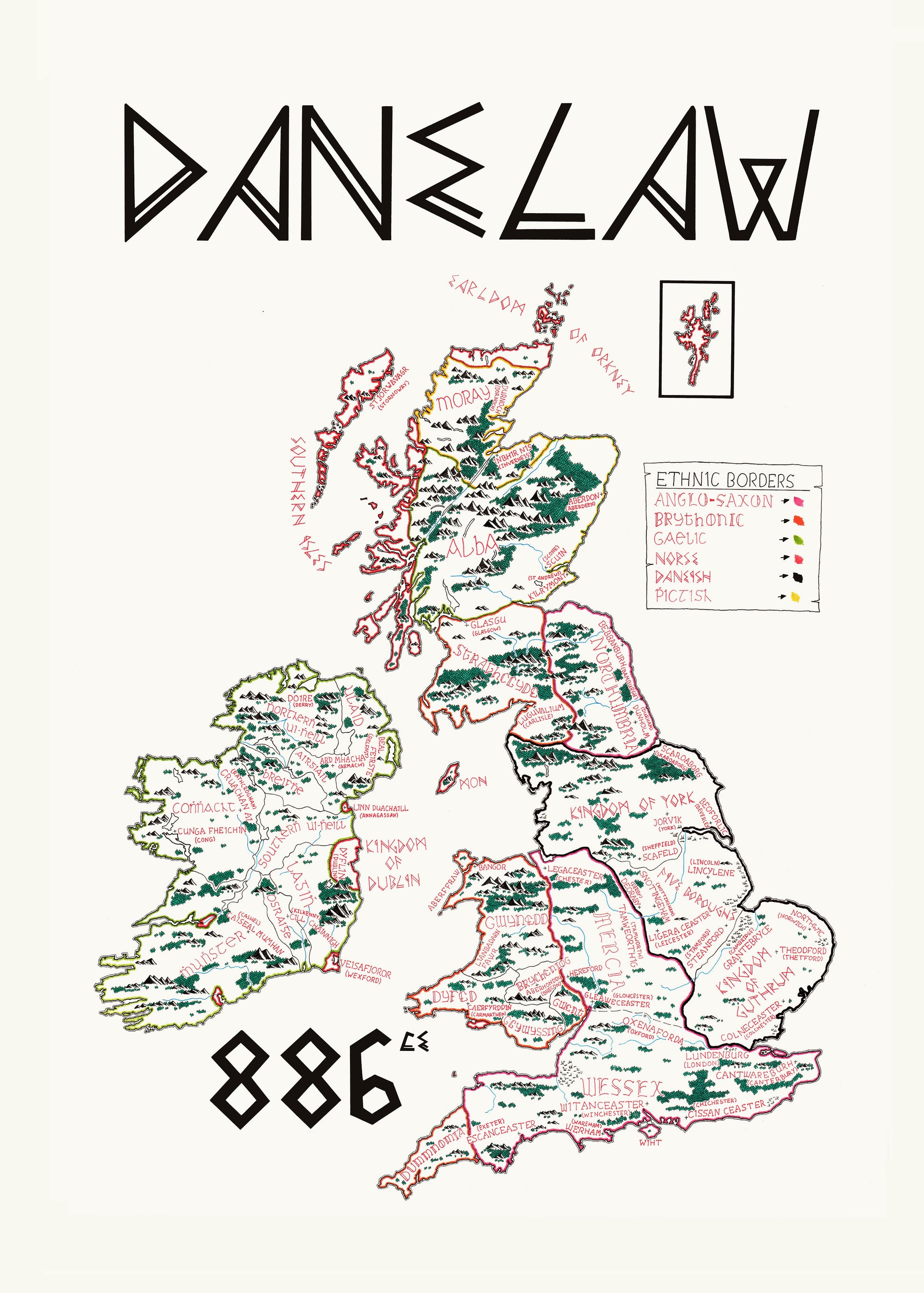 The Danelaw was established in an agreement between Alfred of Wessex and the Danish Viking Guthrum, dividing England into two spheres of influence. Yet it was not only England but the entire Isles that underwent dramatic change with the arrival of the Vikings. This map includes all the kingdoms and notable territories across the British Isles, along with important towns and cities of the period. The kingdoms are color-coded by ethnic categories such as Dane, Anglo-Saxon and Brittonic.