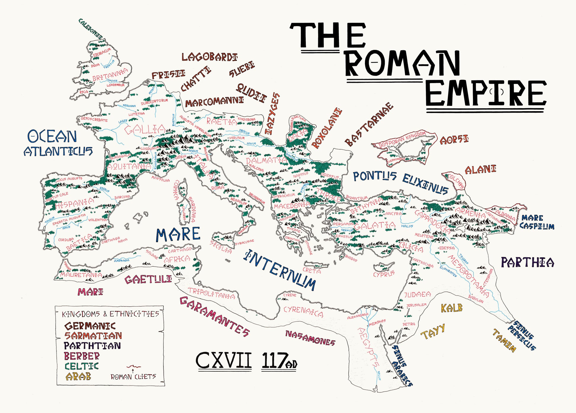 The map illustrates the empire in 117 AD during the reign of Emperor Trajan, including the briefly held territories of Mesopotamia, conquered from Rome’s enduring rival, the Parthians.